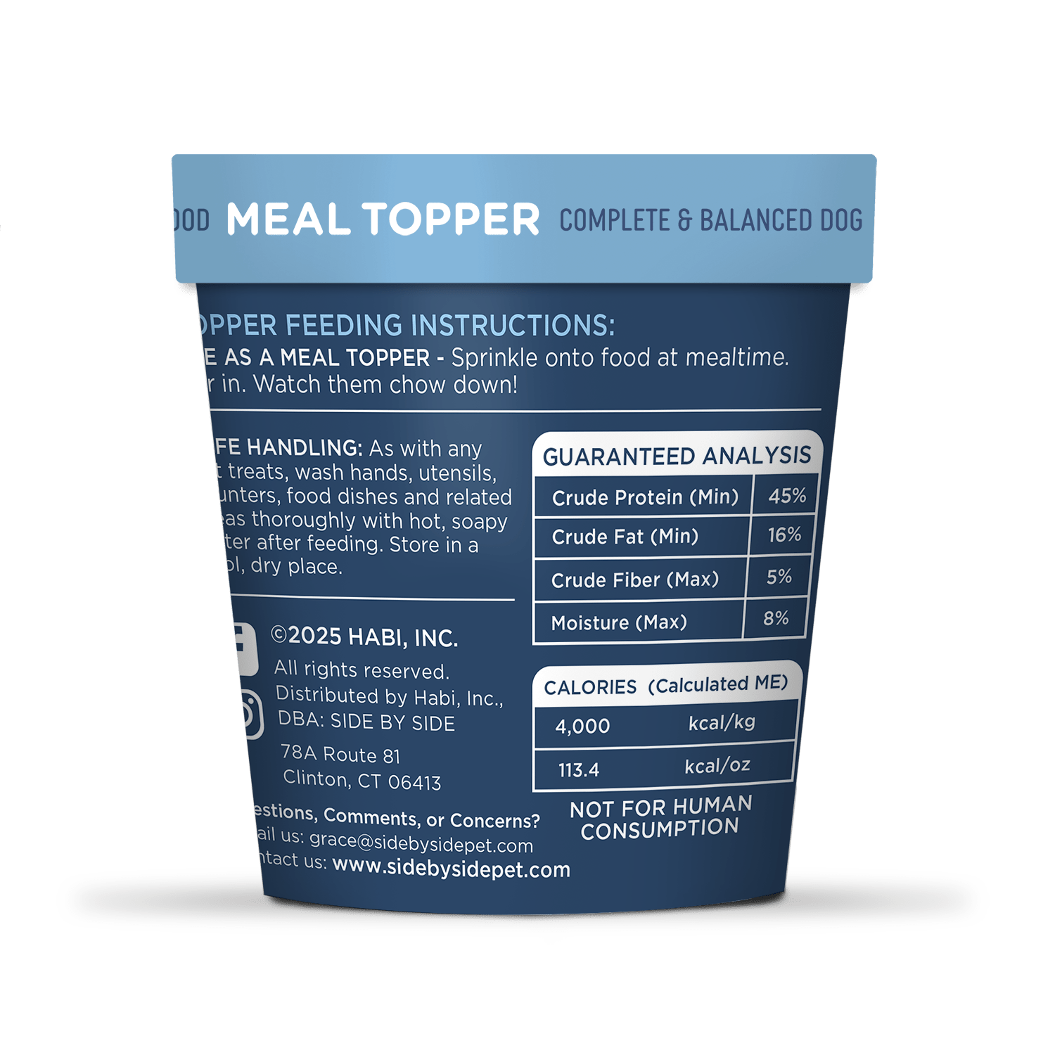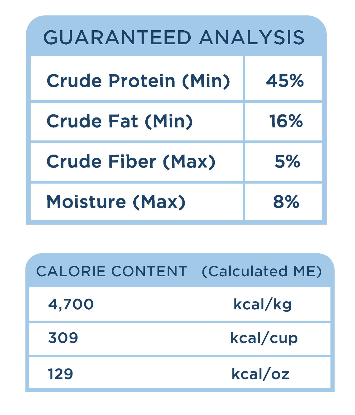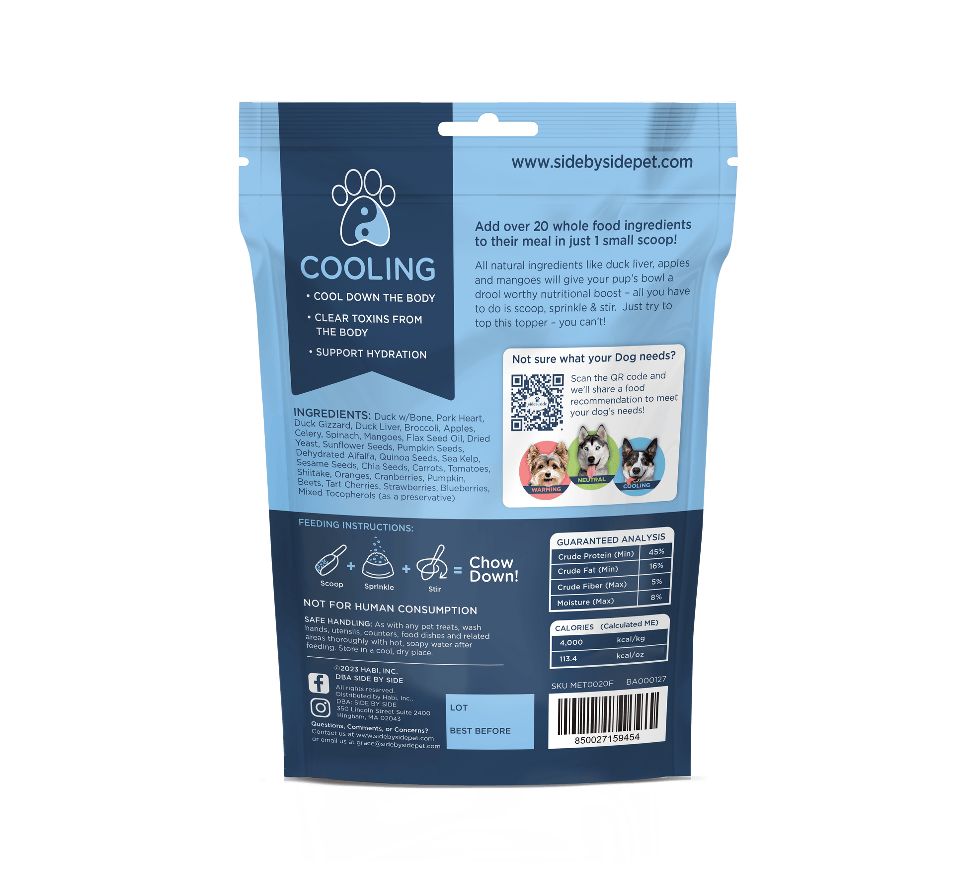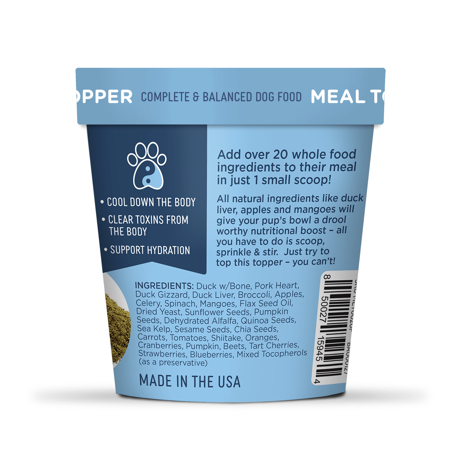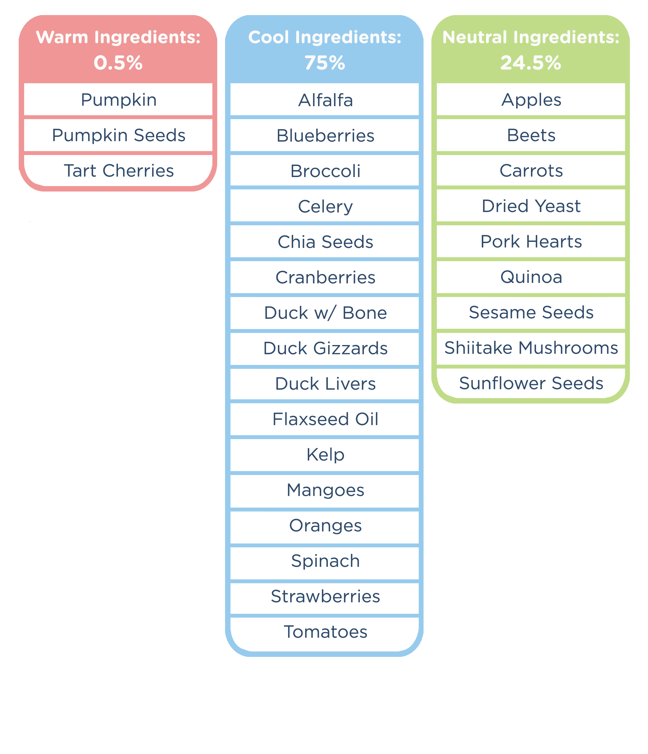 Duck w/ Bone, Pork Hearts, Duck Gizzards, Duck Livers, Broccoli, Apples, Celery, Spinach, Mangoes, Flaxseed Oil, Dried Yeast, Kelp, Sunflower Seeds, Pumpkin Seeds, Dehydrated Alfalfa, Quinoa Seeds, Sesame Seeds, Chia Seeds, Carrots, Tomatoes, Shiitake Mushrooms, Oranges, Cranberries, Pumpkin, Beets, Tart Cherries, Strawberries, Blueberries, Mixed Tocopherols (as natural preservative).