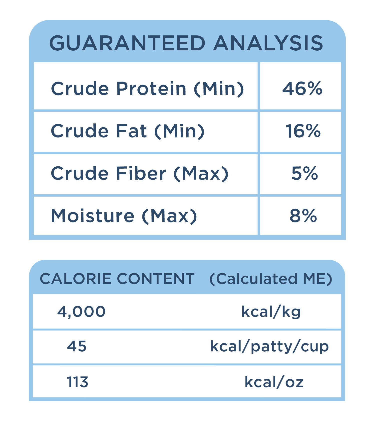 Duck w/ Bone, Pork Hearts, Duck Gizzards, Duck Livers, Broccoli, Apples, Celery, Spinach, Mangoes, Flaxseed Oil, Dried Yeast, Sunflower Seeds, Pumpkin Seeds, Dehydrated Alfalfa, Quinoa, Kelp, Sesame Seeds, Chia Seeds, Carrots, Tomatoes, Shiitake Mushrooms, Oranges, Cranberries, Pumpkin, Beets, Tart Cherries, Strawberries, Blueberries, Sunflower Oil, Mixed Tocopherols (as natural preservative).