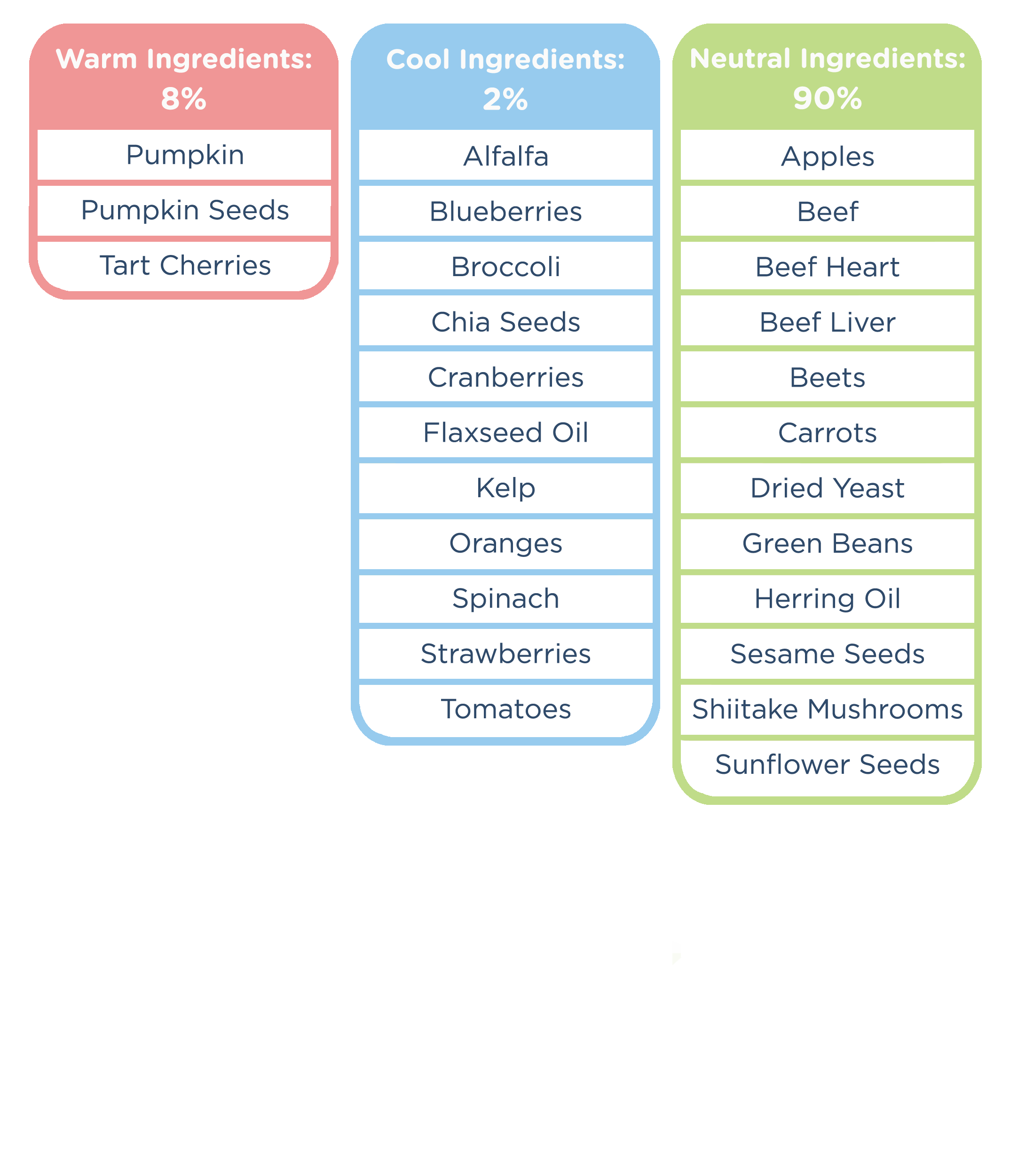 Beef, Beef Hearts, Beef Livers, Beef Kidneys, Beef Lungs, Carrots, Pumpkin, Green Beans, Apples, Beets, Flaxseed Oil, Dried Yeast, Sunflower Seeds, Pumpkin Seeds, Dehydrated Alfalfa, Quinoa Seeds, Sea Kelp, Sesame Seeds, Herring Oil, Chia Seeds, Tomatoes, Shiitake Mushrooms, Broccoli, Oranges, Cranberries, Spinach, Tart Cherries, Strawberries, Blueberries, Mixed Tocopherols (as a preservative).