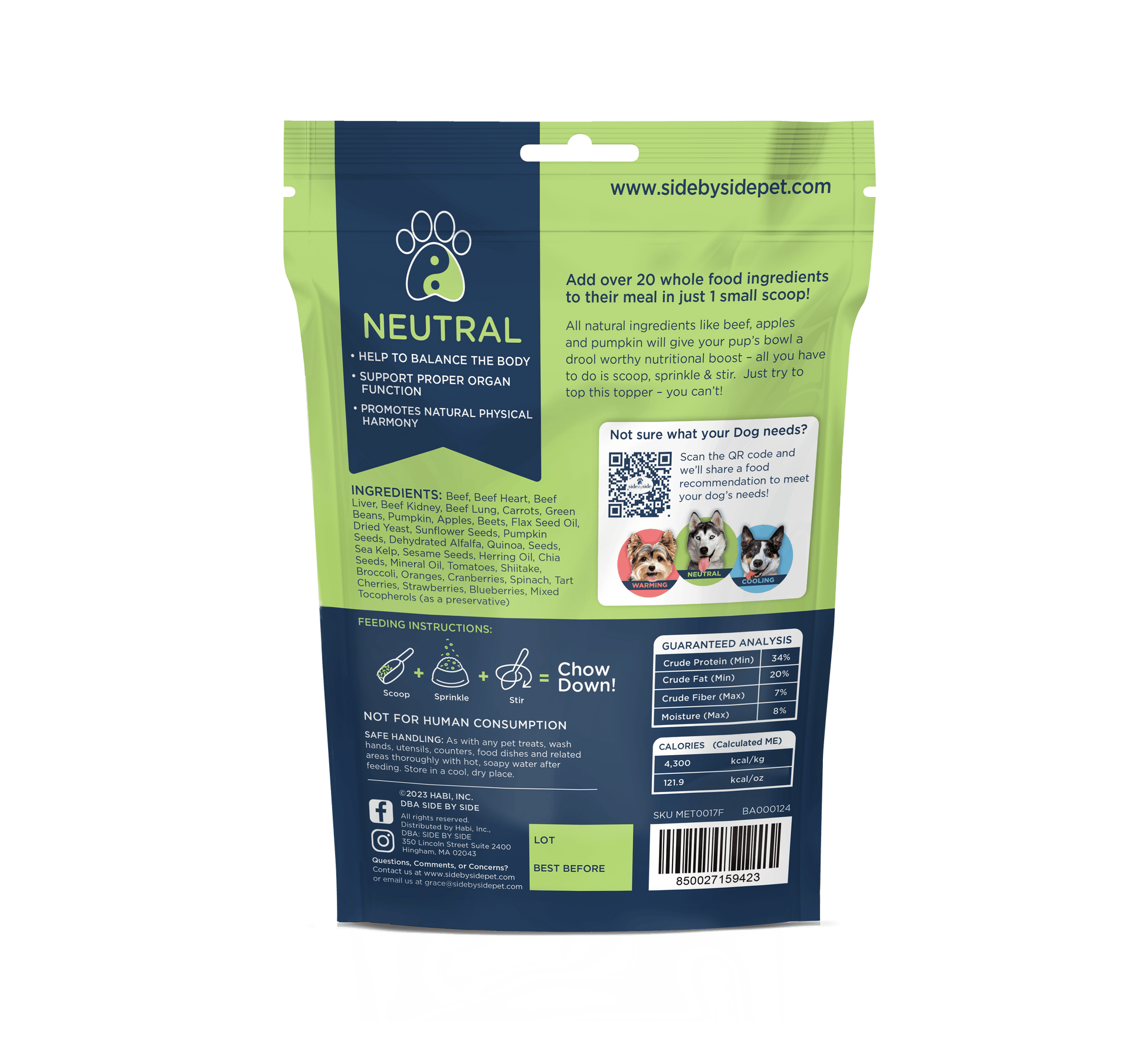 Beef, Beef Hearts, Beef Livers, Beef Kidneys, Beef Lungs, Carrots, Pumpkin, Green Beans, Apples, Beets, Flaxseed Oil, Dried Yeast, Sunflower Seeds, Pumpkin Seeds, Dehydrated Alfalfa, Quinoa Seeds, Sea Kelp, Sesame Seeds, Herring Oil, Chia Seeds, Tomatoes, Shiitake Mushrooms, Broccoli, Oranges, Cranberries, Spinach, Tart Cherries, Strawberries, Blueberries, Mixed Tocopherols (as a preservative).