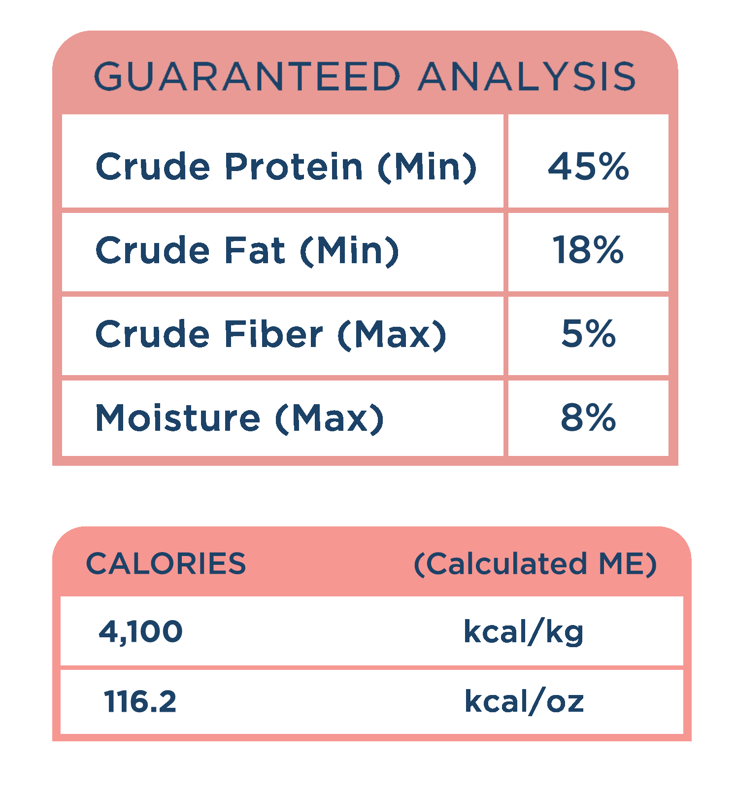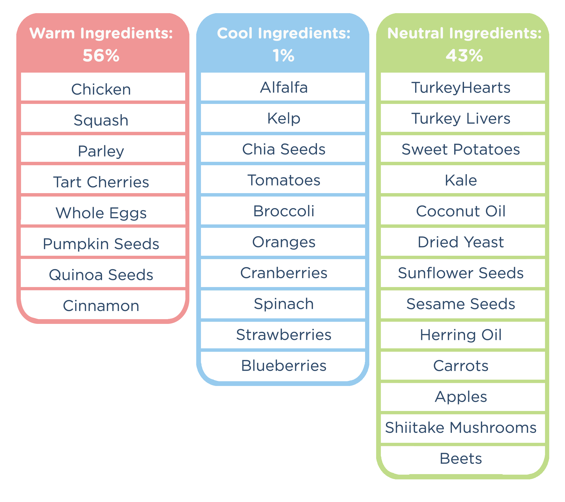 Chicken, Turkey Hearts, Turkey Livers, Sweet Potatoes, Squash, Kale, Parsley, Cherries, Whole Eggs, Coconut Oil, Dried Yeast, Sunflower Seeds, Pumpkin Seeds, Dehydrated alfalfa, Quinoa Seeds, Kelp, Sesame Seeds, Herring Oil, Chia Seeds, Cinnamon, Broccoli, Oranges, Cranberries, Pumpkin, Spinach, Beets, Strawberries, Blueberries, Mixed Tocopherols (as a preservative).